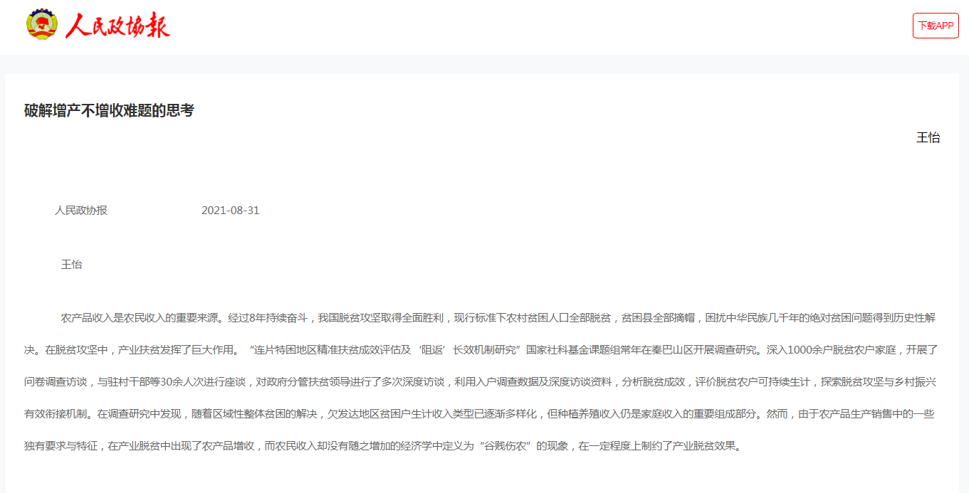 《人民政協報》2021年8月31日刊發了我校陜西高校新型智庫商洛發展研究院院長王怡署名文章《破解增產不增收難題的思考》,對文章中的國家社科基金項目“連片貧困地區精準扶貧成效評估及‘阻返’長效機制研究”的研究成果做了專題報道。