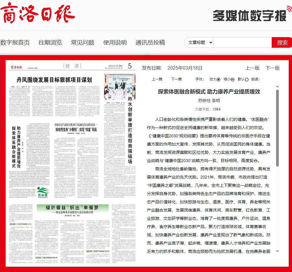 商洛全域地處秦嶺腹地,擁有得天獨厚的自然資源優勢,具有發展體育康養產業的先天優勢。2021年,商洛市委、市政府提出打造“中國康養之都”發展戰略,幾年來,全市上下聚焦這一戰略定位,充分發揮自身優勢,加強各類特色生態產品的品牌培育和保護,推進生態產品價值轉化,加快旅游與生態、溫泉、醫療、體育、養老等相關產業融合發展,發展民宿康養、體育休閑、房車野營、紅色教育、工業旅游、文創研學等新業態,培育了一批度假康養、戶外運動、溫泉療養、食療養生等新業態新產品,聚力打造排球名城、體育賽事名城,加快康養產業創新發展,康養產業呈現出了新氣象和新成效。然而,康養產業底子薄、起步晚、增速慢,康養人才培養和產業發展缺乏有力的抓手和載體,商洛應順勢而為搶抓發展機遇,在完善養老服務保障、創新“體醫+康養”模式、提升康養產業效能等方面加大力度,助推康養產業高質量發展。
