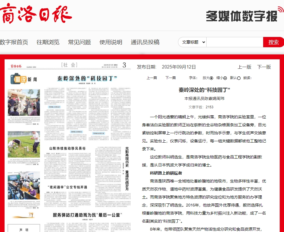 商洛是陜西唯一全域地處秦嶺腹地的地級市,生物多樣性豐富,優質天然農作物、道地中藥材資源富集,為健康食品研發提供了天然沃土。而商洛學院聚焦地方特色資源的研究定位和為地方服務的辦學理念,深深吸引了胡選生。2016年,他放棄國外優厚待遇,毅然選擇扎根秦嶺腹地的商洛學院,用科技力量為鄉村振興注入新動能,成了一名名副其實的“科技園丁”。