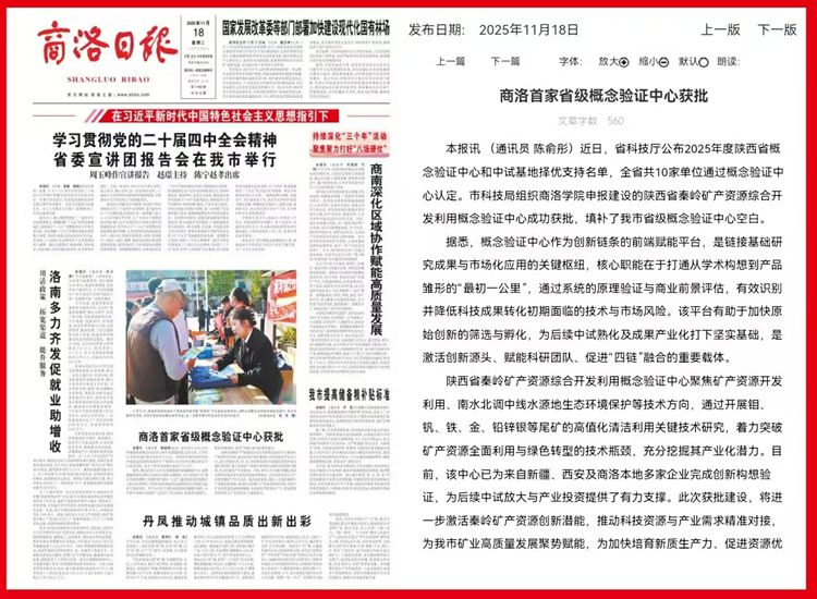 本報訊 (通訊員 陳俞彤)近日,省科技廳公布2025年度陜西省概念驗證中心和中試基地擇優支持名單,全省共10家單位通過概念驗證中心認定。市科技局組織商洛學院申報建設的陜西省秦嶺礦產資源綜合開發利用概念驗證中心成功獲批,填補了我市省級概念驗證中心空白。