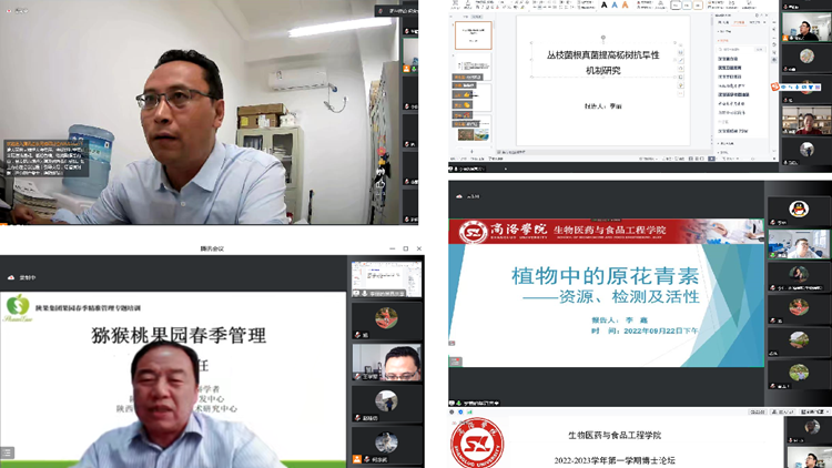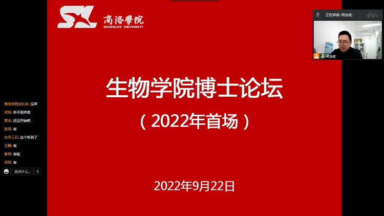 9月22日,生物醫藥與食品工程學院博士論壇2022年首場學術交流活動在云端順利舉行。本次論壇特邀我院2位客座教授——西北大學博士生導師趙桂仿,陜西省農村科技開發中心、陜西省獼猴桃工程技術研究中心主任雷玉山研究員蒞臨云端全程指導。生物學院院長王學軍出席論壇活動。生物學院全體教師及部分畢業班學生在線上參加論壇。論壇由副院長何念武主持。