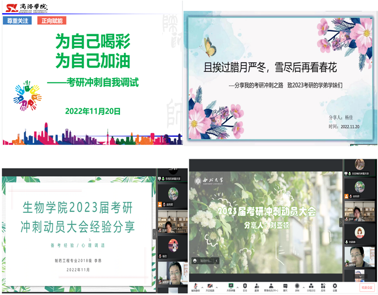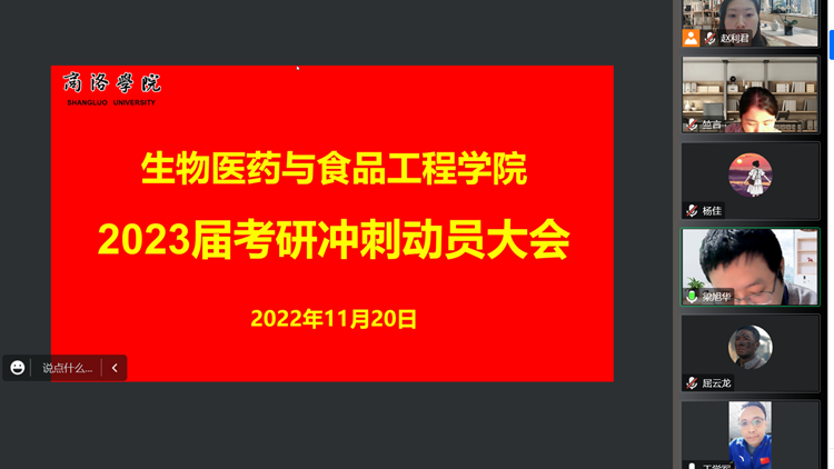 為了充分調動2023屆畢業生考研積極性,盡早明確考研目標與就業方向, 11月20日晚,生物學院通過釘釘線上平臺組織召開了2023屆考研沖刺動員大會。學院黨政領導、教師代表及2023屆考研學生參加會議。