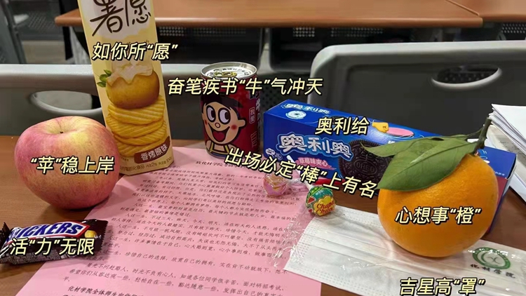 活動中,化材學院為全院考研學子送上了寓意吉星高“罩”、如你所“愿”、“牛”氣沖天、“棒”上有名、“蘋”穩上岸、心想事“橙”、活“力”無限的“一研成碩”大禮包,也送去了凝聚全院師生殷殷期望和濃濃祝福的《致化材學院考研學子的一封信》。
