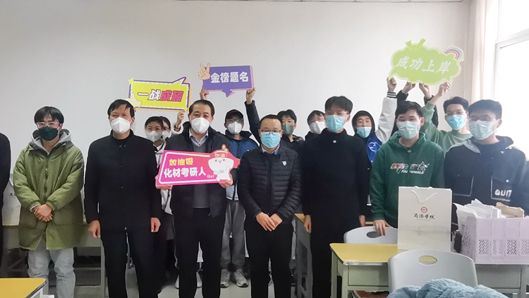 活動結束后,參與活動的領導和老師與120余名考研學子合影留念,同學們高舉“一戰成碩”“金榜題名”“成功上岸”和“加油呀,化材考研人”等專屬定制手舉牌留住美好的瞬間。
