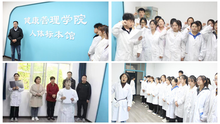 護理系系主任贠航從多方面對學院人體標本館作了介紹,實驗室中心主任陳穎宣讀了《人體標本館進館須知》,護理系教師王濤帶領(lǐng)與會師生詳細參觀了人體標本館,學生代表胡虔熙帶領(lǐng)全體學生重溫了醫(yī)學生誓言。