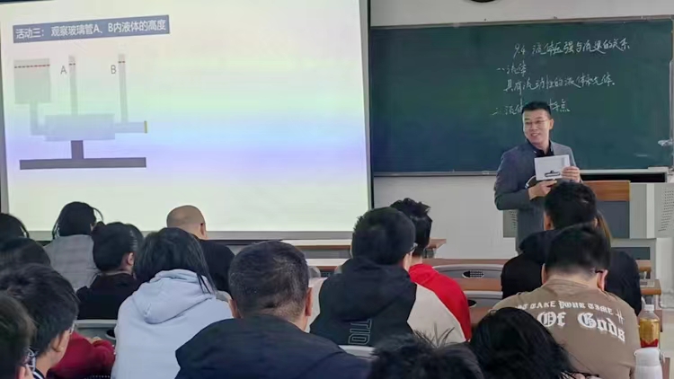 水江麗老師以《聚焦核心素養,促進深度學習》為題作了專題學術報告,從核心素養重構未來教育藍圖、基于核心素養的教學設計和促進深度學習的教學建議三個方面闡述了中學物理教學中如何聚集核心素養培養、促進學生深度學習。柴勇勇老師在示范教學《流速與壓強的關系》一課講授中,從小實驗引入新課,通過圖片補充讓學生輕松接受流體的概念,再通過實驗讓學生總結得出科學結論,并運用結論解釋生活中的各種現象。
