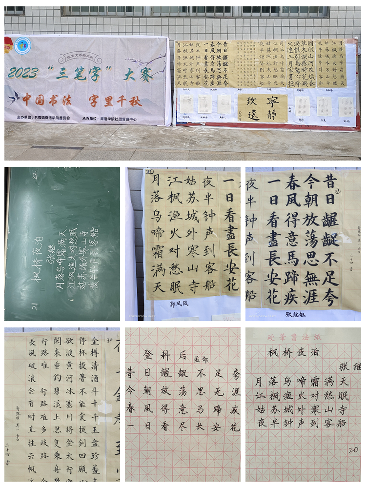 本次大賽自6月初開始,面向全校學生,從前期報名、動員、院級初賽,到校級決賽歷時近一個月,共有600余人參加初賽,60人進入校級決賽。決賽分為鋼筆組、粉筆組和毛筆組三個賽道。參賽題目、內容均選自我國各類優秀古詩詞。
