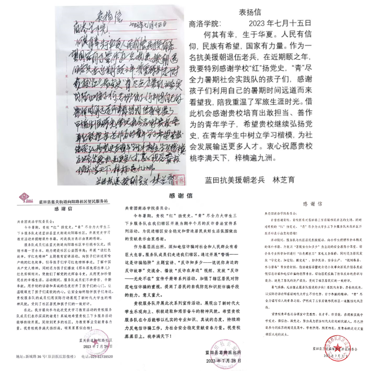 實踐活動扎實開展 社會團(tuán)體高度認(rèn)可。活動期間,實踐隊全體隊員工作準(zhǔn)備充分、實踐狀態(tài)積極、內(nèi)容豐富充實。向參與活動的社區(qū)居民、學(xué)生普及黨史知識,對其提升政治能力起到了明顯的促進(jìn)作用,受到當(dāng)?shù)孛癖姷囊恢潞迷u,收到了來自抗美援朝老兵林芝育手寫表揚(yáng)信1封和來自藍(lán)關(guān)街道向陽路社區(qū)、葛牌派出所、三官廟移民社區(qū)感謝信3封,字里行間承載了受訪者和實踐單位對電信學(xué)院"紅"揚(yáng)黨史,“青”盡全力社會實踐隊的感謝和認(rèn)可。