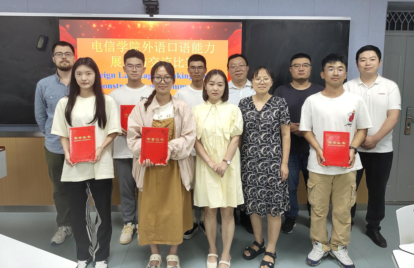 為提高學生外語應用能力,引導學生用責任與擔當講好中國故事,傳播好中國聲音,成為具有家國情懷、國際視野和全球勝任力的新時代好青年,9月8日,電信學院舉辦以“講好中國故事,展現青春風采”為主題的學生外語口語能力展示與交流活動。電信學院院長袁訓鋒出席活動。加拿大籍外教Anton博士,中外合作辦學項目共課教師楊彪、張寧、石玉、孫靜擔任評委。