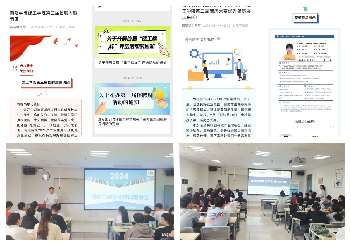 早謀劃,做好就業動員與幫扶。7月10日,建工學院成立了以學院黨委書記楊小鋒為組長的2024屆就業工作專班,制定工作方案,明確責任目標,在分析研判建筑類行業需求情況的基礎上,一是設計和發布建工學院第三屆招聘周邀請函,主動邀請社會用人單位進校召開宣講會;二是分專業分學制做好全體畢業生就業意向調查數據采集,明確就業方向;三是召開2024屆畢業生就業動員會,所有畢業班輔導員及班主任及時進班召開就業主題班會,從建筑類專業就業形勢特點、樹立正確的就業觀念、求職準備、心理輔導、就業安全等幾個方面為畢業生解答疑惑;四是建立家庭經濟和就業困難畢業生幫扶臺賬,成立幫扶小組,學院班子成員主動帶頭聯系幫扶,主動開展就業助推暖心服務;五是同步舉辦第三屆簡歷設計大賽,以賽促就業,196名畢業生提交簡歷,評選出10份優秀簡歷進行展示,引導學生設計完善簡歷為參加招聘宣講會做充分準備;六是教師主動幫扶學生做好職業規劃,城鄉規劃專業馬驍等老師主動指導學生設計簡歷、開展學生面試應聘模擬等,助力學生早就業。