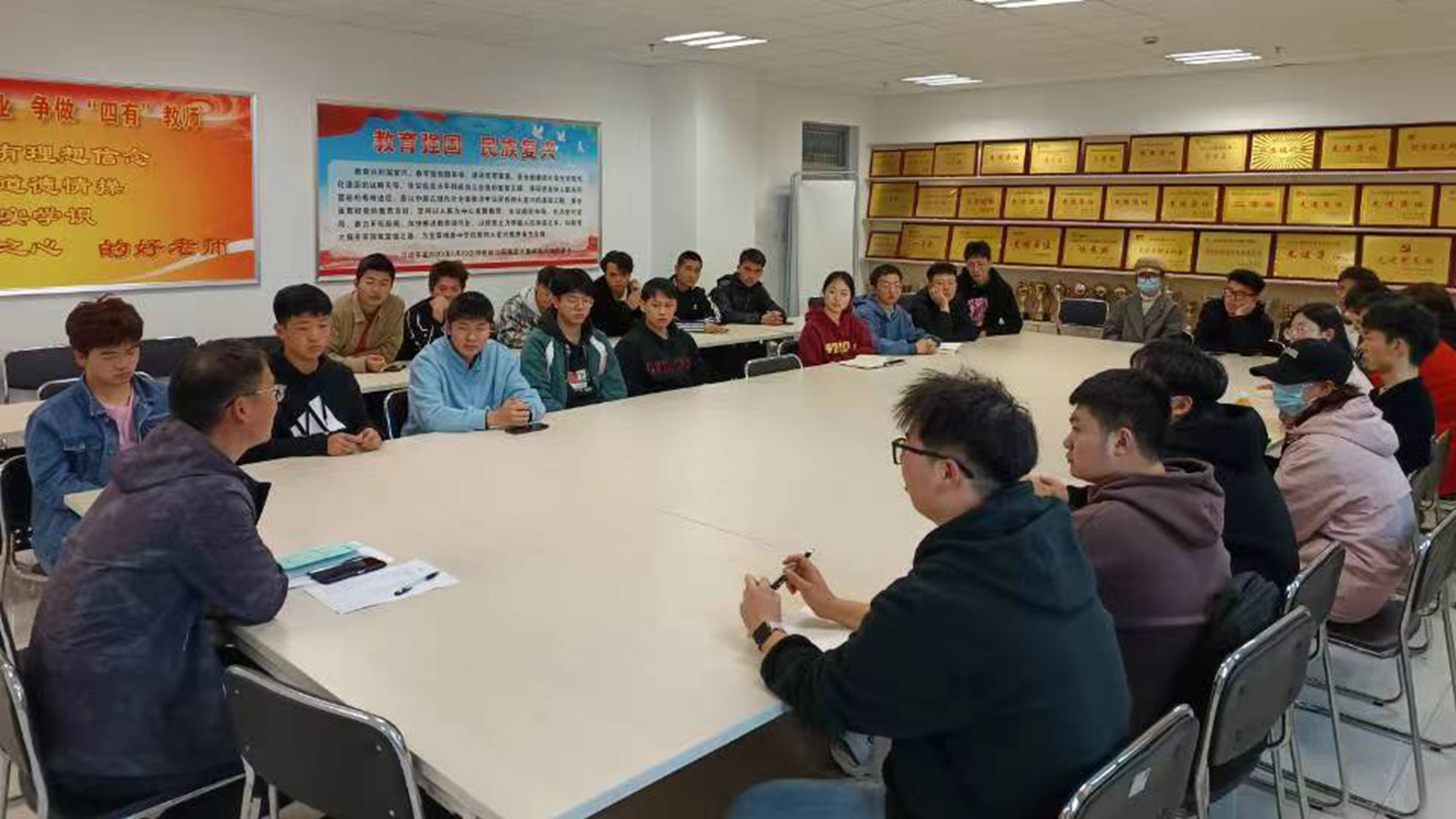 強(qiáng)化班長隊伍責(zé)任擔(dān)當(dāng)意識,發(fā)揮班長的集體帶頭作用及引領(lǐng)作用。11月8日,班長座談會上,在對畢業(yè)學(xué)位資格審查、獎助學(xué)金評定、推優(yōu)入黨、綜合素質(zhì)測評等方面深入解讀的基礎(chǔ)上,學(xué)院全體輔導(dǎo)員與37位班長代表圍繞學(xué)習(xí)環(huán)境創(chuàng)設(shè)、學(xué)生寢室用電用水、專業(yè)學(xué)科競賽、學(xué)院集體活動組織等方面進(jìn)行充分交流。與會班長代表劉永杰和徐秋駿就班級凝聚力建設(shè)、學(xué)風(fēng)建設(shè)、學(xué)生志愿活動、活動組織等方面進(jìn)行經(jīng)驗(yàn)分享。