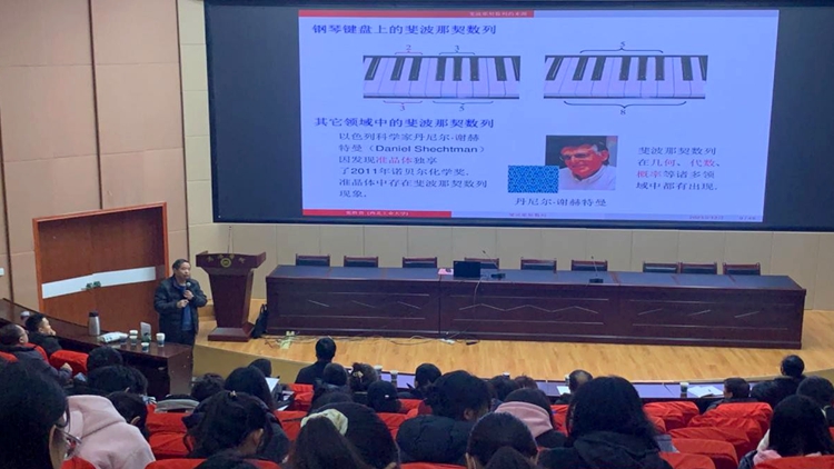 張勝貴教授以《斐波那契數列》為題,從數列的來源、與黃金分割的關系和應用等方面,完整、詳細地介紹了斐波那契數列。整場報告深入淺出,與會師生共同體驗斐波那契數列的美與價值。