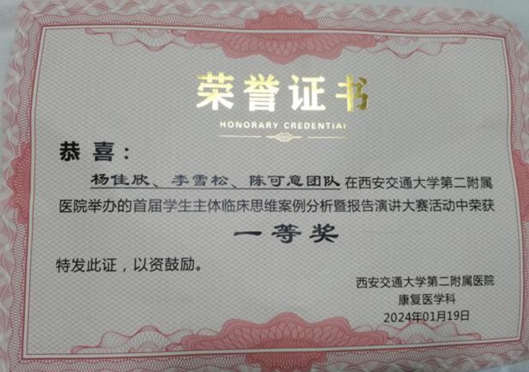 1月17日,西安交通大學第二附屬醫院舉辦首屆“明德知行,慎思醫道”學生主體臨床思維案例分析大賽總決賽。健康管理學院20級康復治療學專業實習生組隊參加,與眾多實習生、研究生和規培生同臺競技。最終陳可意團隊以冷靜的頭腦、精準的判斷、深入的分析,流利的言語表達和形象的情景演繹,獲得一等獎。