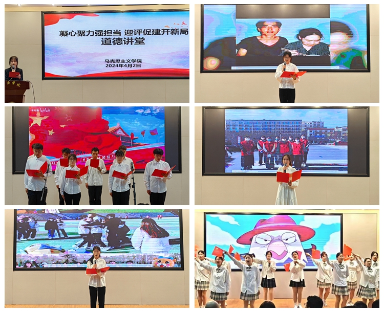 為激發師生干事創業熱情,以昂揚的精神風貌迎接教育部審核評估,4月2日,馬克思主義學院在學校圖書館一樓報告廳舉辦了“凝心聚力強擔當,迎評促建開新局”道德講堂。校黨委委員、宣傳部部長王霄飛蒞臨指導,馬克思主義學院黨政領導、全體教師及學生黨員、入黨積極分子、團學干部參加了活動。