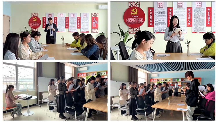 4月10日,學生第二黨支部開展“以文化之力,作答何以中國”學習交流活動。黨員代表唐楠楠、韓雨馨帶領大家朗讀了《青春中國》《永遠跟黨走》《如果信仰有顏色》等優秀紅色經典篇目?;顒悠陂g,全體黨員認真學習了習近平總書記關于推進社會主義文化強國建設的重要論述,入黨積極分子分享了學習感悟。全體師生合唱《我和我的祖國》,將活動氛圍推向了高潮,通過歌聲表達出對黨、對祖國的無限贊美和滿腔熱愛。