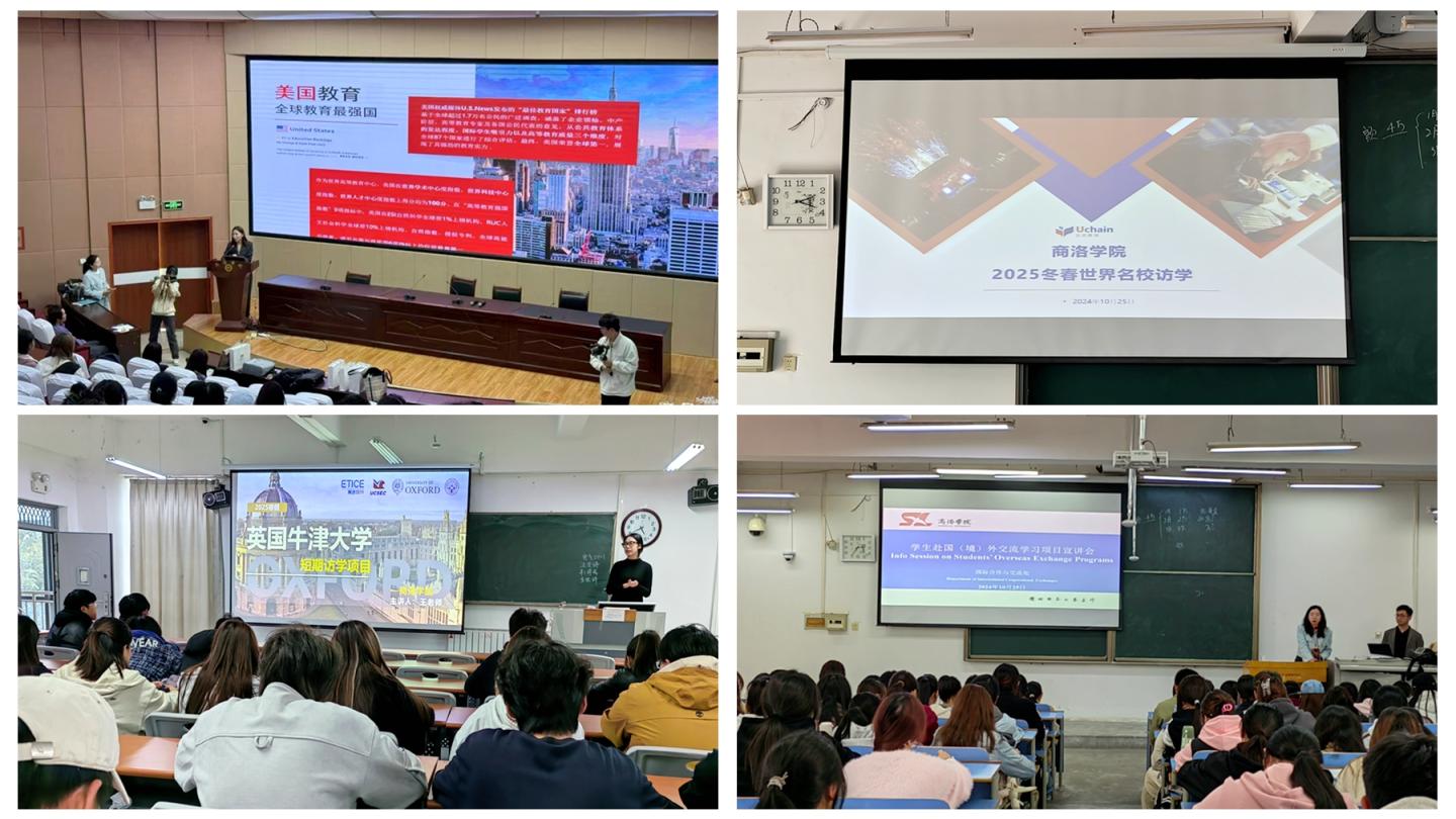 宣講會上,英國班戈大學(xué)、美國俄勒岡州立大學(xué)、美國克拉克大學(xué)和美國加利福尼亞科技大學(xué)校方代表分別介紹了各校辦學(xué)概況和合作項目詳細內(nèi)容。大灣區(qū)名校短期訪學(xué)與名企實訓(xùn)項目、新加坡國立大學(xué)醫(yī)學(xué)生命科學(xué)主題課程項目和赴美帶薪實習(xí)項目負責(zé)人分別介紹了各項目內(nèi)容和具體開展情況。國際合作與交流處相關(guān)工作人員介紹了我校學(xué)生赴國(境)外交流學(xué)習(xí)概況、合作交流平臺相關(guān)情況、獎勵資助政策和創(chuàng)新學(xué)分認定政策。