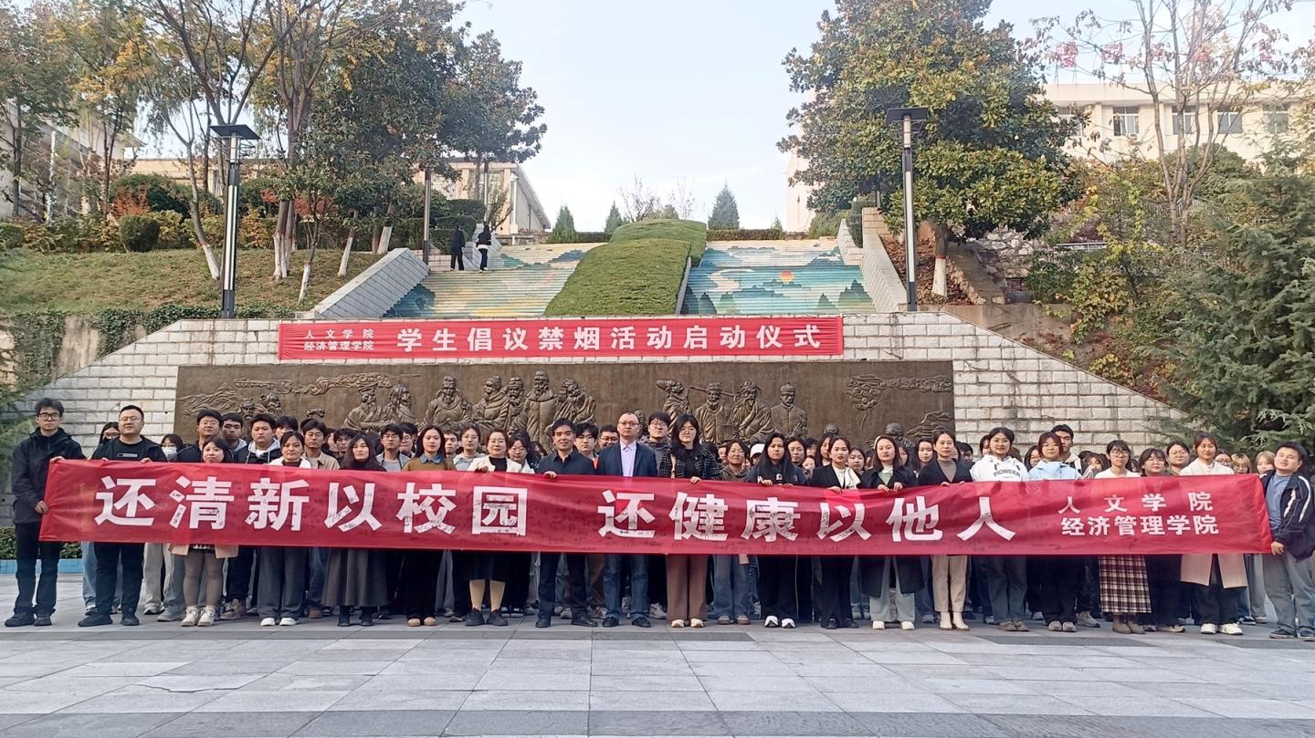為營(yíng)造良好校園環(huán)境、倡導(dǎo)校園文明行為新風(fēng)尚,10月29日下午,人文學(xué)院、經(jīng)濟(jì)管理學(xué)院聯(lián)合開展以“還清新以校園還健康以他人”為主題的學(xué)生倡議禁煙活動(dòng)。活動(dòng)啟動(dòng)儀式在玉蘭廣場(chǎng)舉行,人文學(xué)院黨委副書記王剛主持啟動(dòng)儀式。經(jīng)濟(jì)管理學(xué)院黨委副書記賈長(zhǎng)安講話。兩院學(xué)工辦主任、團(tuán)總支書記、全體輔導(dǎo)員和學(xué)生代表400余人參加活動(dòng)。