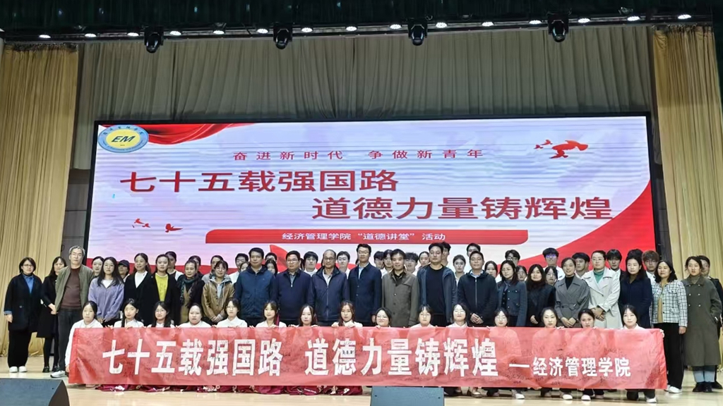 為宣傳學習道德模范事跡,創新開展大學生思想道德教育、弘揚社會主義核心價值觀形式,激發青年學生愛國之情、強國之志,10月30日,經濟管理學院舉辦了“七十五載強國路,道德力量鑄輝煌”主題道德講堂。學校黨委委員、宣傳部部長王霄飛,經管學院黨政領導、全體教職工及學生代表參加活動。