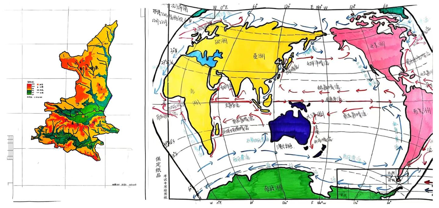 藝術(shù)與地理交融,繪就山河經(jīng)緯。為提升師范生繪圖能力與空間思維素養(yǎng),探索出“地理+美育”的創(chuàng)新路徑,4月17日至29日,“筆繪經(jīng)緯,圖攬?zhí)煜隆钡乩砝L圖大賽如期舉行。43名參賽者以專業(yè)測繪功底為基,用水彩、馬克筆等媒介再現(xiàn)地理風(fēng)貌。學(xué)院從科學(xué)準(zhǔn)確性、藝術(shù)表現(xiàn)力和創(chuàng)意新穎性三個維度進(jìn)行綜合排序,最終評選出9份作品在院內(nèi)公開推廣學(xué)習(xí)。
