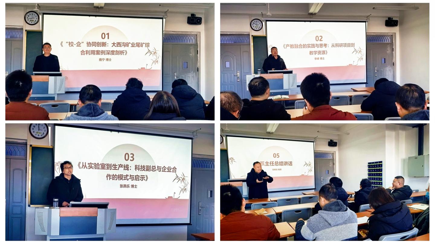 南寧以《大西溝礦業尾礦綜合利用案例深度剖析》為題,系統展示了從技術攻關到產業應用的完整范本;李峰在《產教融合的實踐與思考》中,生動闡釋了如何將橫向課題轉化為優質教學資源;張燕樂則從“科技副總”視角出發,在《從實驗室到生產線》報告中剖析了產學研全鏈條的合作模式與教學價值。