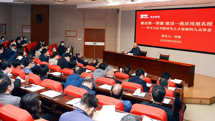 鄧?yán)碓趫?bào)告中以《激活第一資源建設(shè)一流應(yīng)用型名校——學(xué)習(xí)習(xí)近平新時(shí)代人才思想的幾點(diǎn)體會》為題,圍繞“正確認(rèn)識是前提;遵循制度是基礎(chǔ);德才兼?zhèn)洹⒁缘聻橄仁窃瓌t;用心尊重是關(guān)鍵;人人皆可成才、人人盡展其才是目的”等五個(gè)方面,詳細(xì)闡述了習(xí)近平總書記關(guān)于新時(shí)代人才工作的重要論述重要指示精神,針對如何激發(fā)人才創(chuàng)新活力,為我校一流學(xué)院建設(shè)提供有力的人才支撐作出了具體指導(dǎo)。