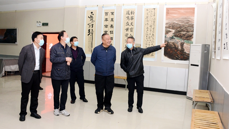 報(bào)告結(jié)束后,鄧?yán)碓趶堉静⑴砘④姷鹊呐阃拢巴鶊D書館藝術(shù)學(xué)院展廳參觀了我校“培根鑄魂廉潔育人”廉政文化藝術(shù)作品展。