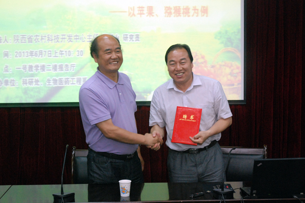 6月7日上午,我校舉行兼職教授受聘儀式,陜西省科技廳農村科技開發中心主任雷玉山研究員受聘為我校兼職教授,副院長劉建林為雷玉山頒發了聘書。雷玉山還為我校生物醫藥工程系師生作了題為《農產品質量安全問題與對策》的專題報告,并向我校捐贈了多部個人著作