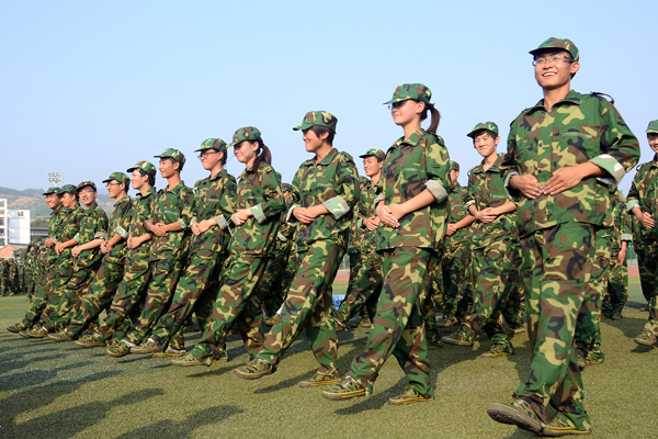9月12日,2013級新生軍訓已進入第6天。來自全國24個省(市、自治區)的3000余名學生編成6個營36個連,正在熱火朝天地進行軍事訓練