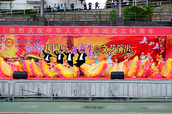 為慶祝新中國第64個生日,迎接2013級新生,9月26日下午,我校舉辦了“2013慶國慶·迎新生”大型文藝演出。西安音樂學院學院70余名師生應邀友情出演,和我校師生、商洛劇團青年歌手李淼輪番登臺獻藝,表演了民樂合奏、歌伴舞、獨唱、舞蹈、健身秧歌等19個節目。熱烈祥和的氣氛、清新高雅的藝術為校園帶來了節日的歡樂和文化的盛宴