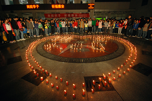 近日,由陜西省委高教工委、陜西大學生在線主辦的2013“中國夢?校園情”大學生原創攝影、微電影大賽公布了評選結果。我校宣傳部王霄飛指導、語言文化傳播學院漢語言文學專業2011級學生張隆康拍攝的作品《祈福雅安》榮獲一等獎,這也是我校學生在省級攝影大賽中首次獲此殊榮