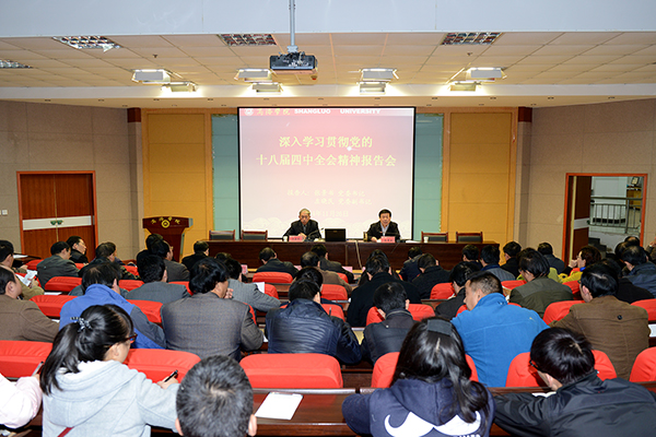 11月26日,我校舉辦深入學習貫徹黨的十八屆四中全會精神報告會。校黨委書記張景書做了學習十八屆四中全會精神輔導報告。張景書強調,全校各級黨組織要以高度的政治責任感和歷史使命感,切實抓好全會精神的學習宣傳貫徹工作,結合學校實際,以依法治教、依法辦學為重點,抓好全會精神的落實。黨委副書記左曉民主持報告會,并就依法治國方略的背景、體系做了解讀。紀委書記王思懷、副校長魏書堂,全校科級以上領導干部和學生干部聽取了報告